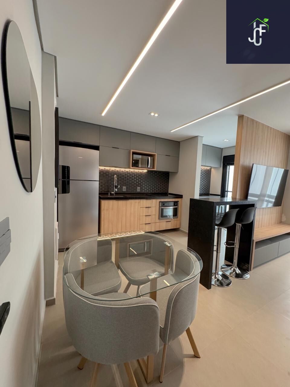 A varanda ampla, com vista privilegiada, é um dos grandes destaques, trazendo luz natural e um espaço perfeito para relaxar. A cozinha já vem totalmente montada, com cooktop, forno, geladeira e micro-ondas, além de acabamentos modernos.