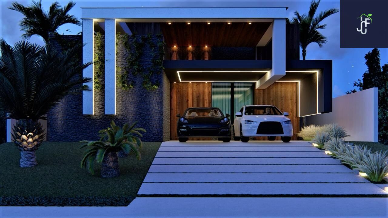 •Fachada com arquitetura moderna e imponente Chegando a 7 metros de altura ao estilo minimalista, detalhes em revestimentos cristais, painel ripado de alumínio amadeirado, janelas em brise oculto e porta pivotante de 4,60m de altura com fechadura eletrônica, vaga para 4 carros sendo 2 cobertos.